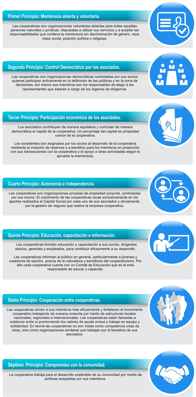 Las cooperativas se basan en los valores de ayuda mutua, responsabilidad, democracia, igualdad, equidad y solidaridad. Estos valores se ponen en práctica a partir de siete principios cooperativos.
